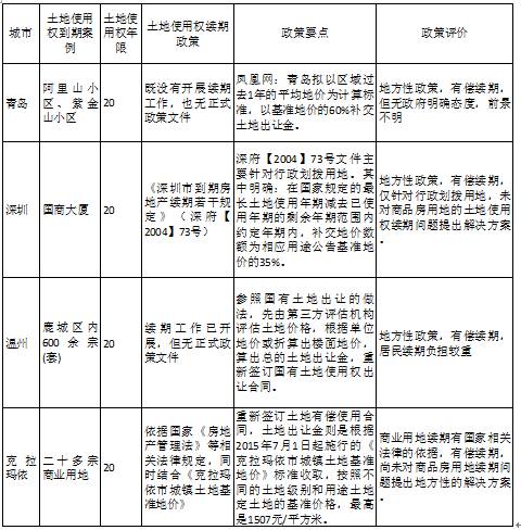 近年来我国部分城市陆续出现的土地使用权到期问题主要是由于在土地制度改革初期这些城市自行划定土地出让年限的结果。青岛是我国最早的14个经济开发区之一,由于当时《暂行条例》还未出台,青岛在土地使用权先行先试的过程中出让了一批20年期限的建设用地。2011年土地使用权到期的青岛阿里山小区就是其中的典型例子。深圳出现土地使用权到期问题的主要是最早一批通过行政划拨方式取得的20年期限的商业用地。早在1982年,深圳出台了《深圳经济特区土地管理暂行规定》,率先推出了国有土地使用权有偿使用制度。其中规定通过行政划拨方式供应经营性用地,并且规定了相应用途的土地使用年期,如工业用地30年,商业用地20年,商品住宅用地50年等。以1980年开始建设的深圳国际商业大厦为例,国商大厦是全国第一栋商用写字楼,根据《深圳经济特区土地管理暂行规定》,国际商业大厦的土地使用权只有20年,到2001年12月31日即截止。与青岛和深圳不同,温州20年产权的住房是政府灵活施政的产物。上世纪90年代初期,为了顺利推进国有土地使用权出让工作,同时考虑到居民的经济承受能力,温州将土地使用权按20年~70年分档,由受让方自行选择办理出让手续,并交纳相应的土地出让金额。而从去年开始,20年期限的这批住宅土地使用权相继到期、或即将面临到期。而从这三个城市对土地使用权到期问题的处理情况来看,几乎无一例外的都采取了有偿续期的方式。其中温州采取了市场评估重新征收土地出让金的方式对土地使用权人的负担最重,由此造成的争议也最大。