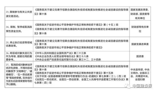 27.取消惩戒对象参加评优评先资格,不得向惩戒对象授予“文明单位”、“道德模范”、“五一劳动奖章”等荣誉。在失信行为发生后获得荣誉称号的予以撤销。